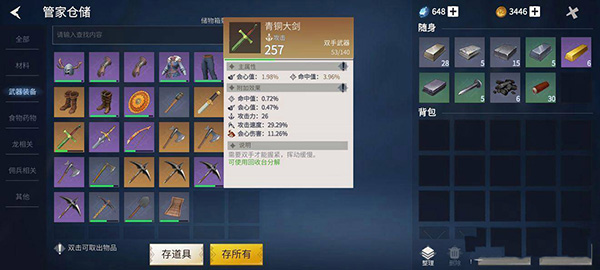 7、增加新武器“战魂双手刀”“战魂之矛”,通过集市粉尘商人处兑换图纸解锁制造。