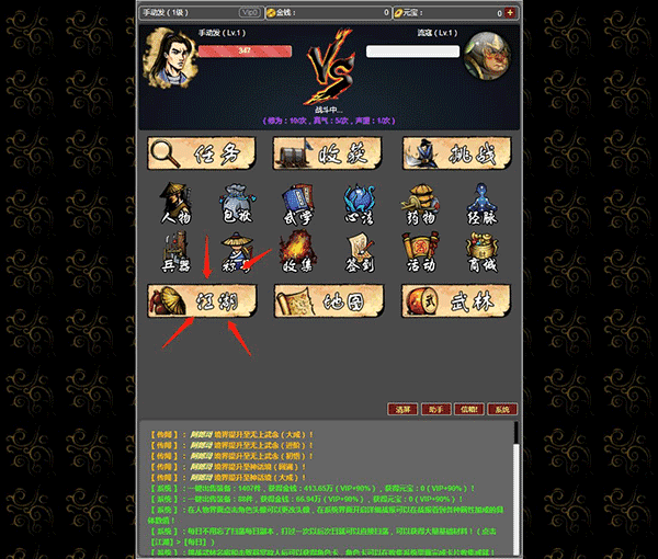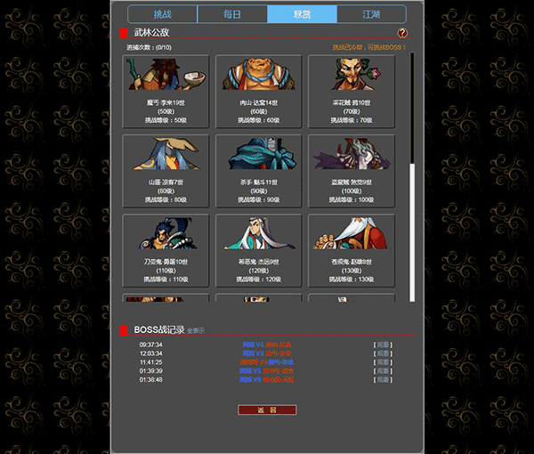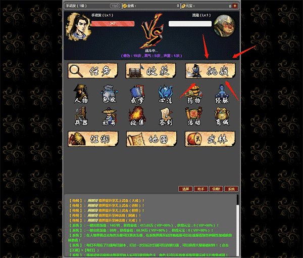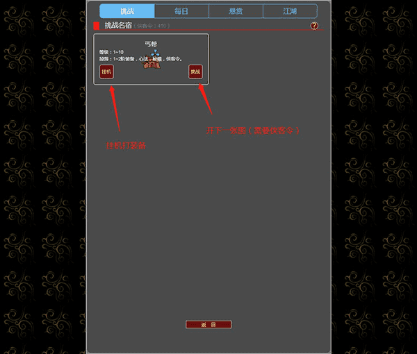 2、【装备来源】:越级打装备主要来源于【江湖】挂机,所以先去江湖挂机打打装备,打出带颜色的装备后去首页【人物】里面换上提升战斗力,挂机到10级左右,打出(礼包领、商店买也行)江湖挑战的门票【侠客令】后点江湖第一张图的【挑战】,打过Boss就可以开第二张图挂机地图了,然后继续挂机打装备开图,收离线(记得收之前先去尝试一下推离线的图到打不过为止再收,别管失败不失败多点几次)。