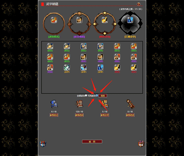 3、【功法来源】:功法指的是武学和心法,首先群公告里面2个礼包码去【系统】里面兑换了(游戏内兑换卡密的地方),然后会得到一堆秘籍碎片啥的去【武学】和【心法】里面抽功法和心法,看看抽到的是啥武器的功法就带啥武器(或者倒过来,打到武器装备先去人物界面一键穿上,然后再回武学界面点可用筛选项,会列出你已学会的当前武器可用的所有武学),要注意的是武器和武学不匹配是用不出技能的,具体自己看武学类型