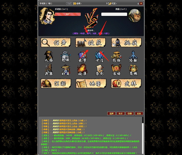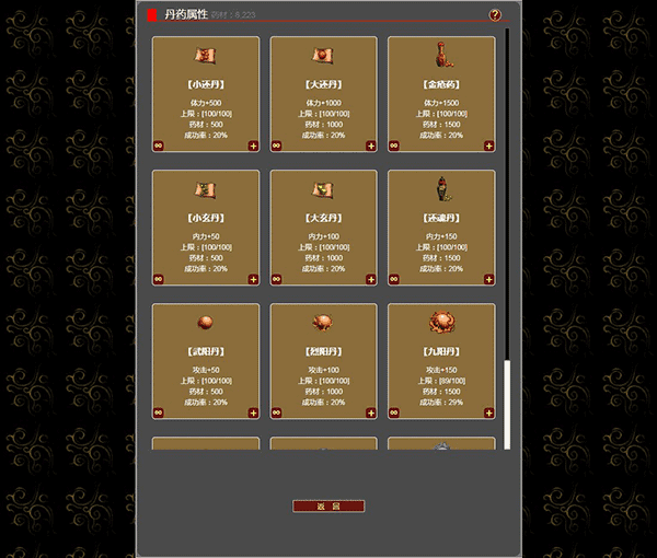 6、【药物作用】打怪挂机装备回收金钱,有金钱买药材(前期不推荐),可以在药材界面优先点攻击和内力,如果抗不住怪就点一些防御和体力。