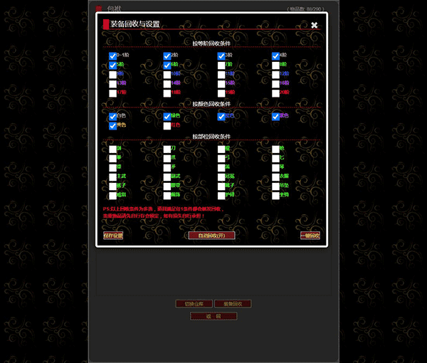 9、【元宝来源】:签到、黄金塔、回收红色专属装备、点券兑换等,顺便说一下装备回收,装备回收是多选不是单选,你选中的任一条件只要满足就会回收。