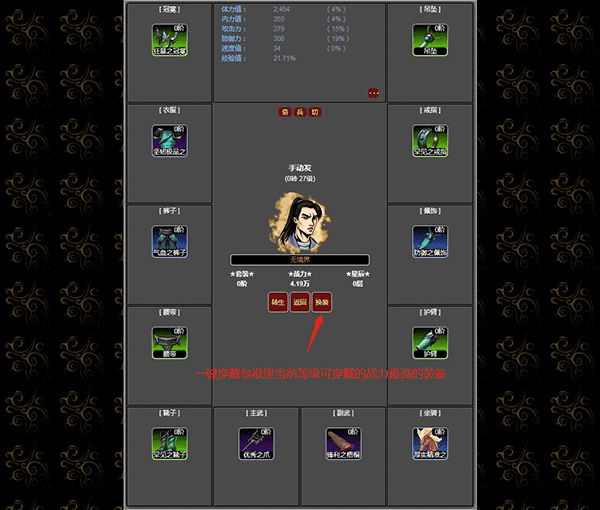 简单来说卡图了就去江湖挂机打装备,装备和暗黑一样有随机词条,别问我哪个好请自行判断(或者有个更简单的办法看装备评分)收离线经验升级。