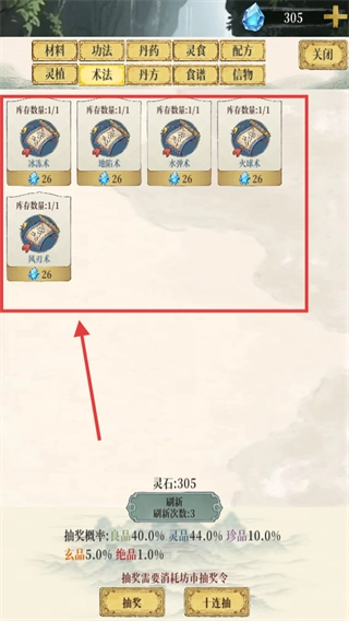 2、在坊市【术法】栏,可花费【26】钻石购买【冰冻术】-【地陷术】-【水弹术】-【火球术】-【风刃术】,学习增强战力。
