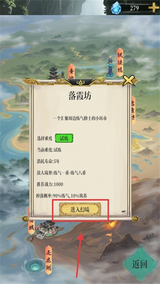 3、落霞坊幻境难度【试炼】,消耗寿命【5】年、推荐战力【1000】,点击进入幻境获取【练气】-【筑基】资源提境界。