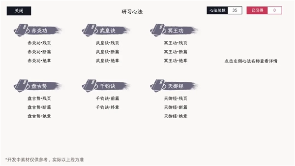 少侠可通过技能书习得门派专属技能,每种职业可习得7个基础武学以及3个门派绝学以及35个门派心法,同时,少侠可以配置4个技能以及1个绝学用于战斗。不同的基础武学配置,会产生不同的连招效果。(此处以刀客为例)